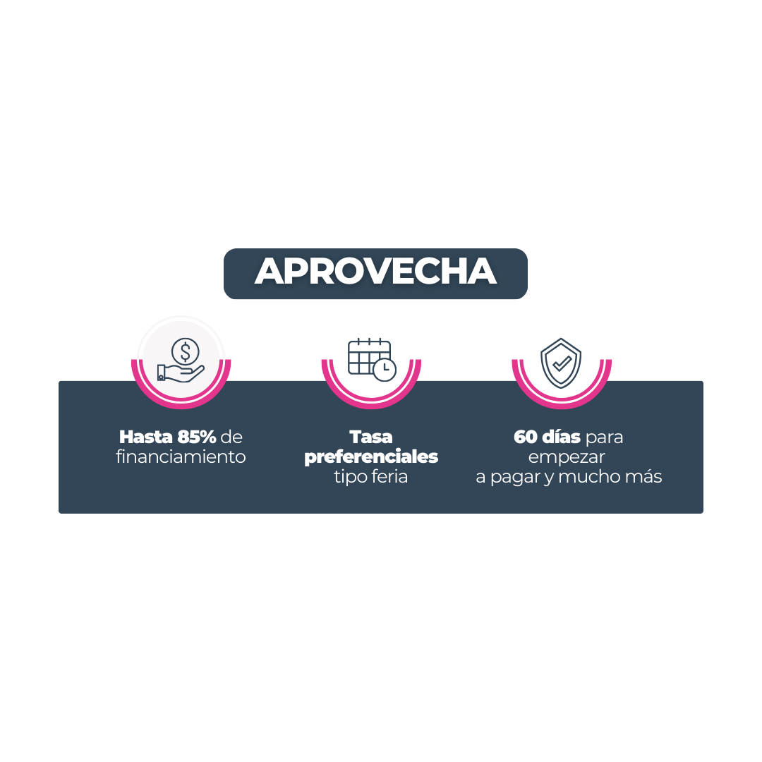 Ofrecemos financiamiento para compra de vehículos desde el año 2000, con hasta el 85% del valor total de este y las tasas más competitivas del mercado. Accede a https://www.montatediunave.com/ para que encuentres el vehículo que te interesa y puedas pre-aprobarte en línea.